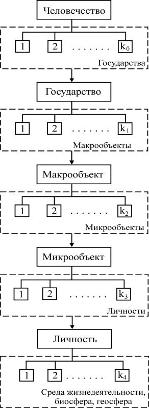 На рис. 1.4 представлены социальные системы различных уровней, которые исторически сложились в процессе жизнедеятельности. Представленная схема отображает взаимосвязь различных объектов, составляющих единую систему, которую создало человечество за всю историю своего существования. Здесь подчеркивается мысль, что человечество – это единая социальная система со всевозможными связями сообществ и обществ, которые все более усиливаются и усложняются в процессе взаимовыгодного общения.