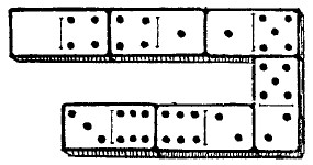 Вы видите на рис. 12. шесть косточек домино, выложенных по правилам игры и отличающихся тем, что число очков на косточках (на двух половинах каждой косточки) возрастает на 1: начинаясь с 4, ряд состоит из следующих чисел очков:
