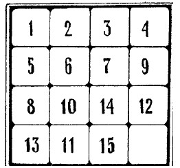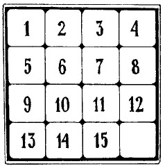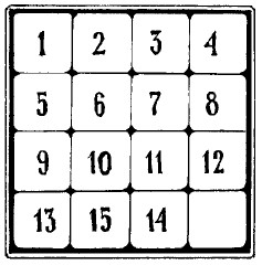 «Давнишние обитатели царства смекалки, – пишет Лойд, – помнят, как в начале 70-х годов я заставил весь мир ломать голову над коробкой с подвижными шашками, получившей известность под именем игры в «15». Пятнадцать шашек были размещены в квадратной коробочке в правильном порядке, и только шашки 14 и 15 были переставлены, как показано на прилагаемой иллюстрации (рис. 16). Задача состояла в том, чтобы, последовательно передвигая шашки, привести их в нормальное положение, причем, однако, порядок шашек 14 и 15 должен быть исправлен.