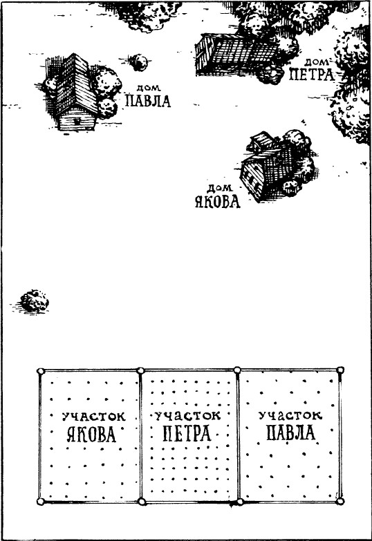 Три брата – Петр, Павел и Яков – получили невдалеке от их домов три участка земли, расположенные рядом. Каждый устроил на своем участке огород. Как видно из рис. 4, дома Петра, Павла и Якова и отведенные братьям земельные участки расположены не совсем удобно. Но братья не могли договориться об обмене. А так как кратчайшие пути к огородам пересекались, то между ними вскоре начались столкновения, перешедшие в ссоры. Желая прекратить распри, братья решили отыскать такие пути к своим участкам, чтобы не пересекать друг другу дороги. После долгих поисков они нашли такие три пути и теперь ежедневно ходят на свои огороды, не встречаясь друг с другом.