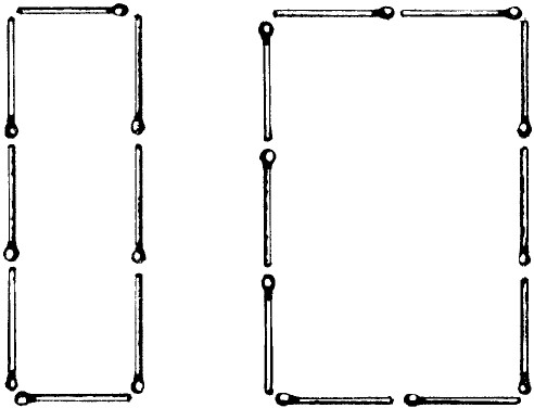 Из 18 спичек нетрудно сложить два четырехугольника так, чтобы один был вдвое больше другого по площади (рис. 10).