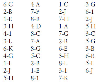 3. В таблице показаны по порядку все переезды, необходимые для того, чтобы помочь заведующему гаражом выйти из затруднительного положения. Цифры обозначают номера автомобилей, а буквы – соответствующие помещения. (6-С означает, что автомобиль 6 ставится в отделение Сит. п.)