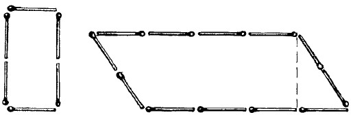 10. На рис. 17 показано, как надо сложить из 18 спичек два четырехугольника, чтобы один был втрое больше другого по площади. Второй четырехугольник является параллелограммом с высотой, равной 11/2 спичкам. Площадь параллелограмма равна его основанию, умноженному на высоту. В основании нашего параллелограмма лежат 4 спички, высота же равна 11/2 спичкам; следовательно, площадь равна 4 ? 11/2, т. е. 6 таким квадратикам, каких в меньшем четырехугольнике 2. Итак, правый четырехугольник имеет площадь втрое большую, нежели левый.