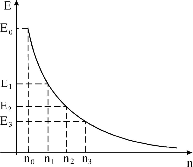 Рассматриваемая ситуация, когда власть первична, а народ и собственность – вторичны, была характерна для России в период строительства коммунизма. При этом по существу вся собственность была сосредоточена в руках государства, а народ был отторгнут от нее. Возможна другая ситуация: когда вся собственность передана народу. Это характерно для таких стран, как, например, Арабские Эмираты. Как правило, для цивилизованного мира характерна ситуация, представленная на рис. 1.11. Здесь n – количество людей, каждый из которых владеет собственностью, эквивалентной энергии Е. Увеличение энергии, приходящейся на одного человека, происходит одновременно с уменьшением количества людей, обладающих энергией такого уровня. Таким образом, крайними или критическими ситуациями будут следующие: xнкр – когда государство отдает всю собственность народу, хвкр – когда государство забрало всю собственность, находящуюся на его территории.