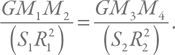 Слева – давление в основании горы массой M2 на первой планете с массой M1 и размером R1, а справа – давление в основании горы массой M4 на второй планете с массой M3 и радиусом R2.