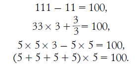 99. Число 100 можно выразить пятью одинаковыми цифрами, употребив в дело единицы, тройки и - всего проще - пятерки: