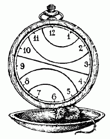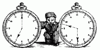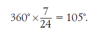 Стрелки на правых часах показывают, как нетрудно сообразить, 9 ч 30 мин. Дуга между их концами содержит 3 % двенадцатых доли полной окружности, или 7/24.
