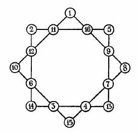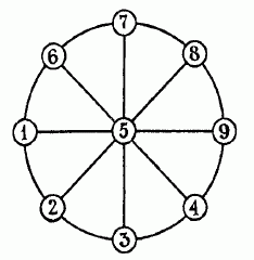 108. Так как сумма всех чисел, обозначенная на циферблате, равна 78, то числа каждого из шести участков должны составлять вместе 78: 6, т. е. 13. Это облегчает отыскание решения, которое показано на рис. 137.