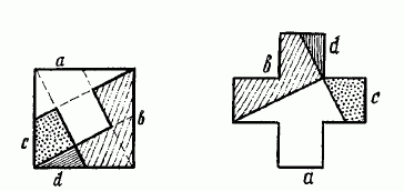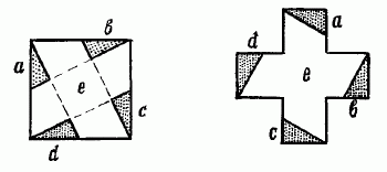 Остается только превратить этот квадрат в равновеликую фигуру Красного Креста (составленную, как известно, из 5 примкнутых друг к другу равных квадратов). Существует несколько способов выполнения такого построения; два из них показаны на рис. 148 и 149.