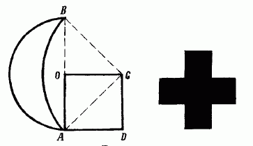 Итак, вот ход построения креста, равновеликого серпу. Концы А и В серпа (рис. 150) соединяют прямой: в середине О этой прямой восставляют перпендикуляр и откладывают ОС=ОА. Равнобедренный треугольник ОАС дополняют до квадрата ОАDС, который превращают в крест одним из способов, указанных на рис. 148 и 149.