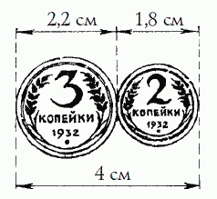 Рис. 95. Монеты в 3 и 2 коп., лежа рядом, составляют 4 см