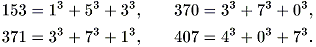 (б) Существуют только четыре числа (кроме 1), равных сумме кубов цифр, например,