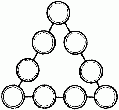 В кружках этого треугольника (рис. 43) расставьте все девять значащих цифр так, чтобы сумма их на каждой стороне составляла 20.