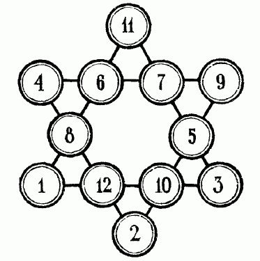 Не удастся ли вам усовершенствовать эту звезду, расставив числа в кружках так, чтобы не только прямые ряды давали одинаковые суммы (26), но чтобы ту же сумму (26) составляли числа на вершинах звезды?