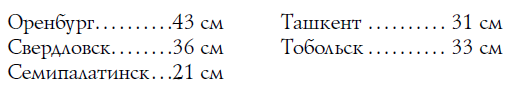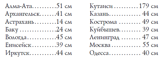 Вот сколько осадков выпадает в среднем ежегодно в разных городах[29] нашего Союза: