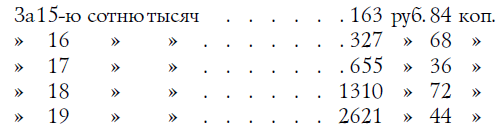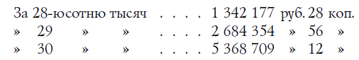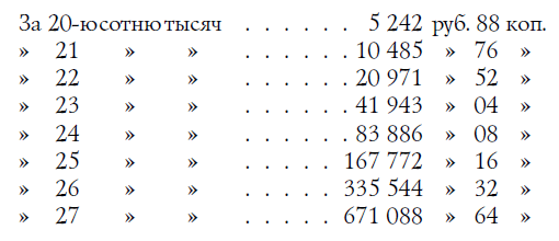 А незнакомец аккуратно являлся каждое утро со своей сотней тысяч. На 8-й день получил он 1 руб. 28 коп., на девятый - 2 руб. 56 коп., на 10-й - 5 руб. 12 коп., на 11-й - 10 руб. 24 коп., на 12-й - 20 руб. 48 коп., на 13-й - 40 руб. 96 коп., на 14-й - 81 руб. 92 коп.