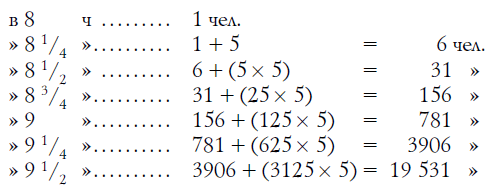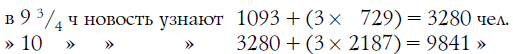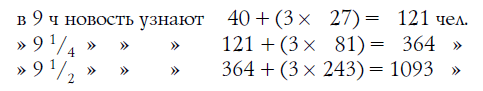 Итак, в 8 1/4 ч утра новость была известна в городе всего только четверым: приезжему и трем местным жителям. Узнав интересную новость, каждый из трех граждан поспешил рассказать ее 3 другим. Это потребовало, допустим, также четверти часа. Значит, спустя полчаса после прибытия новости в город о ней знало уже 4 + (3 х 3) = 13 человек.