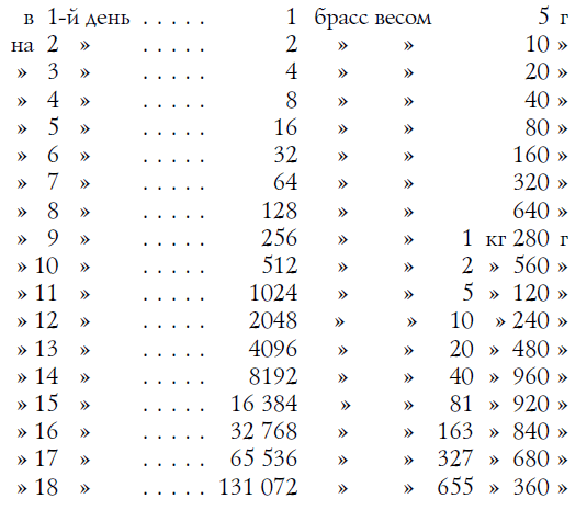 - А дальше - за третью сотню тысяч - 4 копейки, за четвертую - 8, за пятую - 16. И так целый месяц, каждый день вдвое больше против предыдущего.