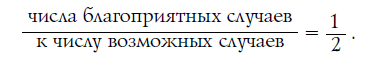 - О, это очень просто! Монета может лечь на стол двояко: вот так - гербом вверх и вот так - гербом вниз. Всех случаев здесь возможно только два. Из них для интересующего нас события благоприятен лишь один случай. Теперь находим отношение