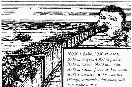 Целый железнодорожный поезд понадобился бы для перевозки тех тонн воды, хлеба, мяса, дичи, рыбы, картофеля и других овощей, тысяч яиц, тысяч литров молока и т. д., которые человек успевает скушать в течение своей жизни. Рис. 91 дает наглядное представление об этом неожиданно большом итоге, более чем в тысячу раз превышающем по весу человеческое тело. При виде его не веришь, что человек может справиться с таким исполином, буквально проглатывая - правда, не разом - груз длинного товарного поезда.