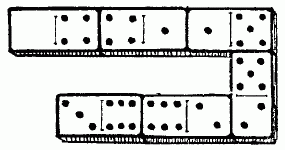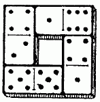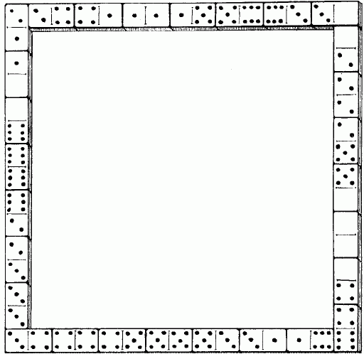 Рис. 9 изображает квадратную рамку, выложенную из костей домино с соблюдением правил игры. Стороны рамки равны по длине, но не одинаковы по сумме очков: верхний и левый ряды заключают по 44 очка, остальные же два ряда - 59 и 32.