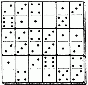Вы видите на рис. 12. шесть косточек домино, выложенных по правилам игры и отличающихся тем, что число очков на косточках (на двух половинах каждой косточки) возрастает на 1: начинаясь с 4, ряд состоит из следующих чисел очков: